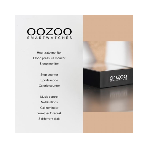 Deze comfortabele OOZOO Q00102 smartwatch is een slim horloge dat je via bluetooth verbindt met je smartphone. Het witte sporthorloge met gouden randje is uitgerust met vele opties waaronder een hartslagmeter, een calorieënteller en een stappenteller. Je kunt een van de kleurrijke digitale opties kiezen om als wijzerplaat in te stellen. Blijf fit en up-to-date met deze trendy smartwatch. Wil je een uniek en persoonlijk horloge? Kies er dan voor om door ons het horloge te laten graveren. De eerste regel is altijd gratis. Klik op de knop ‘graveren’ om jouw eigen inscriptie aan ons door te geven. Leuk om cadeau te geven!